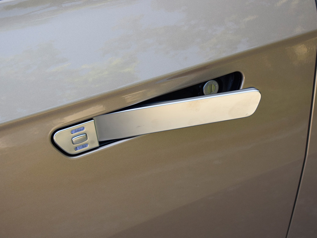 威马EX5的侧面更加趋向如今潮流的溜背造型设计,再加上车身下方黑色防擦条,看起来整台车更加扁平,更加具有运动范,但溜背的设计以及更小的车窗,会不会使得车内人员开扬感较差?同时弹出式的门把手是威马EX5侧面的亮点之一,同时也是威马EX5科技化的体验。