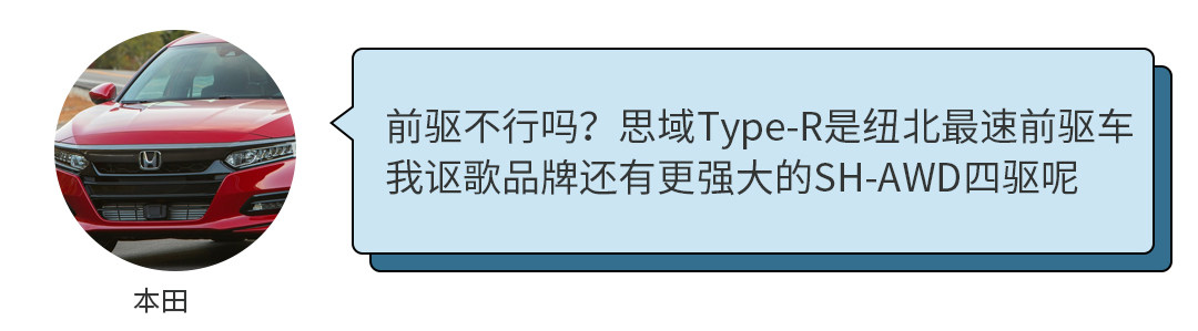 要说在性能车这一板块下,本田一直站队“前置前驱”,思域Type-R的纽北最速前驱车也正正证明了“前驱性能也不赖”,事实本田四驱也相当出色,讴歌品牌的SH-AWD四驱可以非常智能地控制驱动力,不仅有助于越野还利于操控。大众的四驱渗透率更高,18.88万的大众探歌也是具备4-Motion四驱系统。