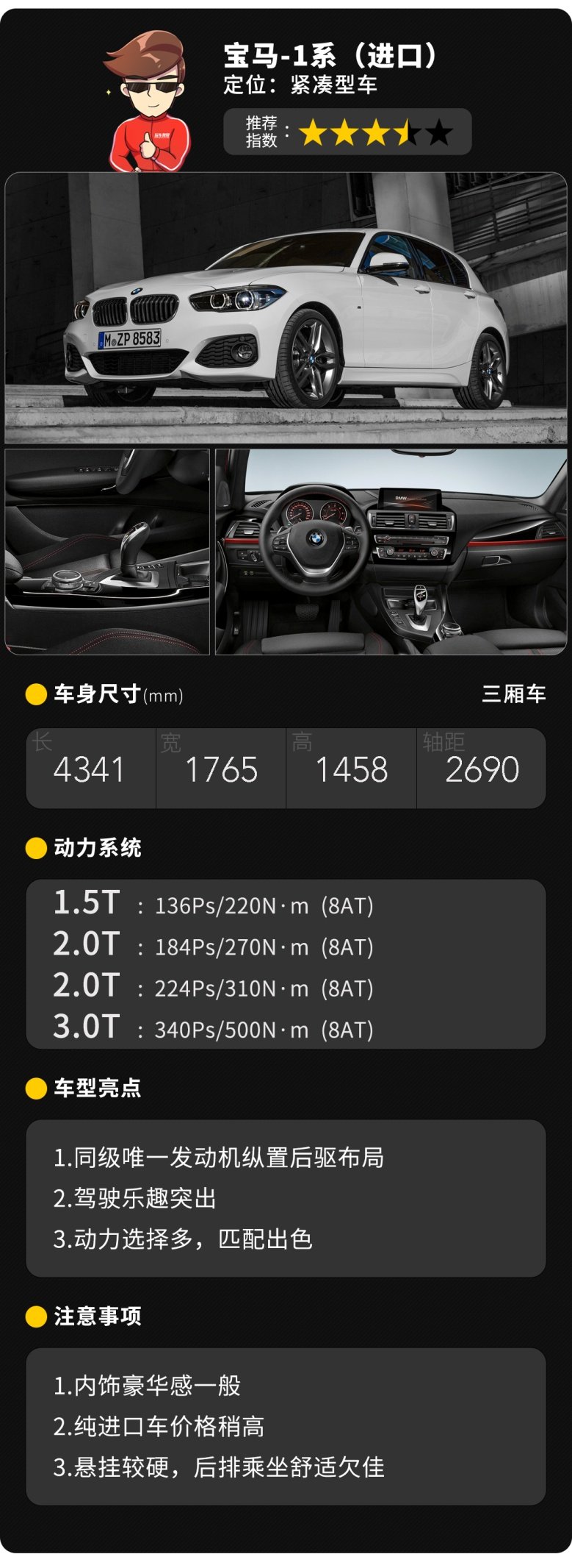 A级车,也叫紧凑型车,顾名思义就是车身尺寸比较紧凑小巧,排量不大,适合对空间要求不高的消费者使用。那么为了在有限的尺寸里创造出更大的空间,车企往往会在紧凑型车上采用发动机前置前驱的布局,后悬架使用占用空间更小扭力梁结构等。但就跟读书时班上总有特立独行的同学一样,有一款车也偏偏不“循规蹈矩”,它就是今天每周车型的主角---进口宝马1系。