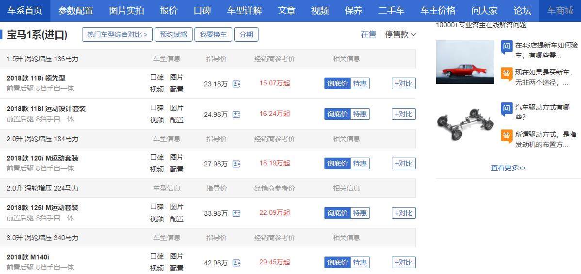 然而这真的是现在大多数的消费者想要的吗?根据笔者的从业经验判断,对于一辆车来说,真正的消费者最注重的第一是价格,第二是品牌,第三是造型,而至于什么动力操控基本是排在倒数的位置。说到外形,其实改款后的进口宝马1系一点都不差,紧凑的两厢车身非常有运动感,只不过千篇一律家族的造型同质化确实比较严重,至少在A3和A级面前,它是最缺少个性与特色的一个。