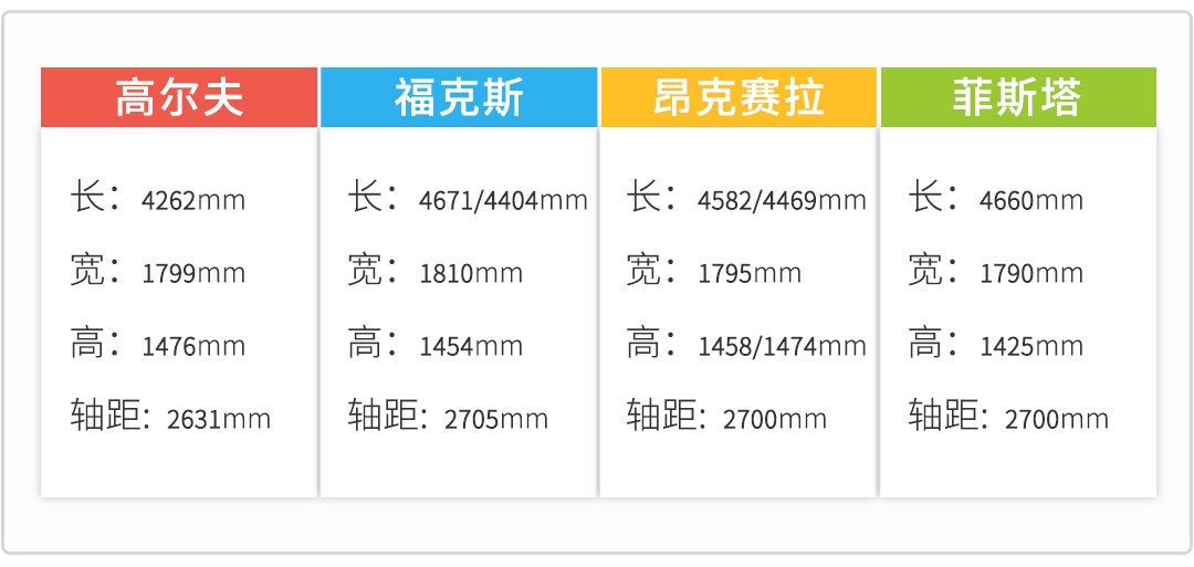 从尺寸对比中能够看出,高尔夫作为一款两厢车型,参数上并不占优势;而福克斯由于换代后的车身尺寸达到了A+级别水准;菲斯塔作为一款对飚思域的产品,除了运动定位外,车身尺寸和空间表现也与思域十分的接近。不过这些肉眼可见的参数并不能完全代表车辆的空间水准,例如昂克赛拉。