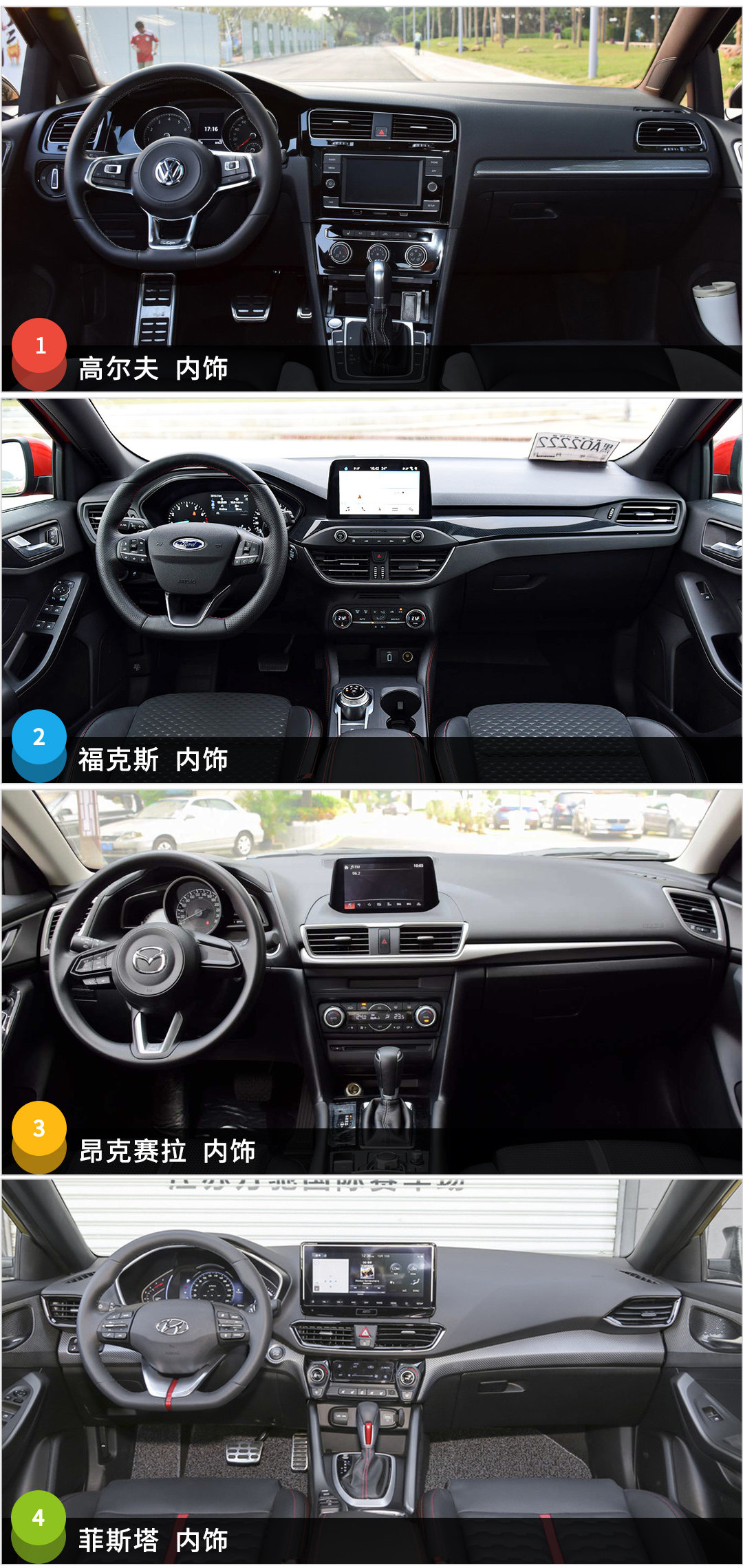 在车辆内饰中,高尔夫由于是MQB平台的加持,在内饰设计上与大众其他车型有着极高的相似度;而福克斯的旋钮式换挡杆虽然起到了优化车内空间的作用,但作为运动车型采用这样的设计还是避免不了网友们的吐槽。昂克赛拉纤细的方向盘设计,和菲斯塔红黑色的内饰搭配,无不彰显车辆运动的个性。值得一提的是其中多款车型均有采用圆形方底的方向盘设计,这似乎也成为了近年来运动轿车的一种潮流。