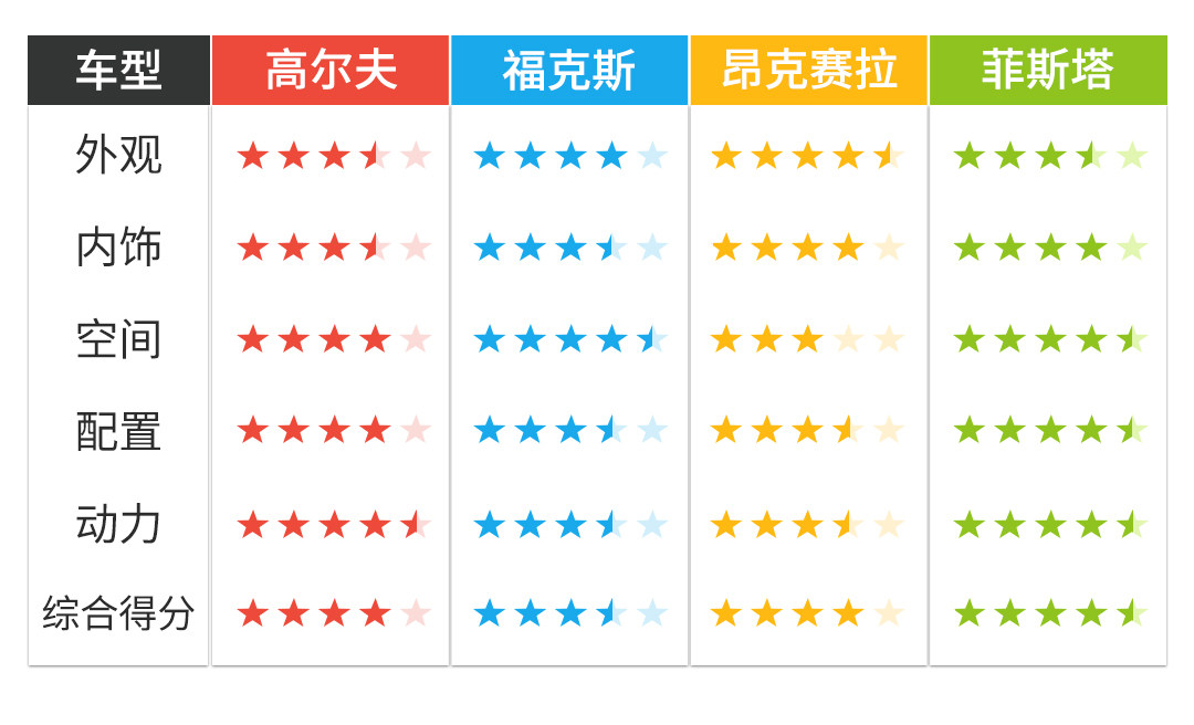 就上述的几款车型而言,教授的第一目标肯定是高尔夫或昂克赛拉,前者有着出色的底盘质感和成熟的动力总成,后者有着精准的操控表现和“人马合一”的驾驶魅力。但回归理性,考虑到未来要为家庭添置一辆实用性较强的轿车,有着配置和空间优势的菲斯塔也许会是一个不错的选择。至于福克斯,除了驾驶乐趣外,终端优惠如果再给力点也许更能刺激消费者的购买欲望。