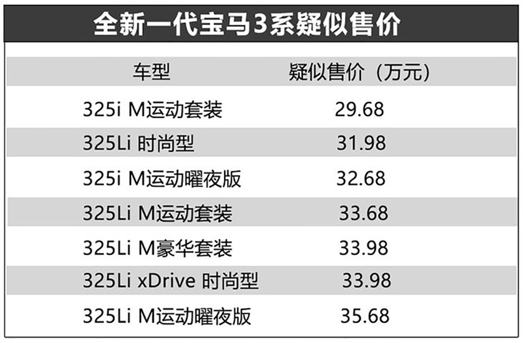 近日,全新一代华晨宝马3系在华晨宝马铁西工厂正式投产下线。新车在此前2019上海车展已经发布,国产新3系分为标轴版(G20)和长轴版(G28),对应轴距为2851mm和2961mm。动力上,新车采用代号为B48B20B的2.0T发动机,匹配ZF 8AT变速箱。有消息称,新车将于6月22日正式上市,疑似官方指导价为29.68-35.68万元。(可能性不大,实际售价可能相差几千块钱)。目前,现款宝马3系价格已经下探到23、24万元,喜欢3系的朋友可以考虑出手,而即将新款上市3系的价格会控制比较紧,如果有条件的朋友也可以加几万考虑宝马5系。