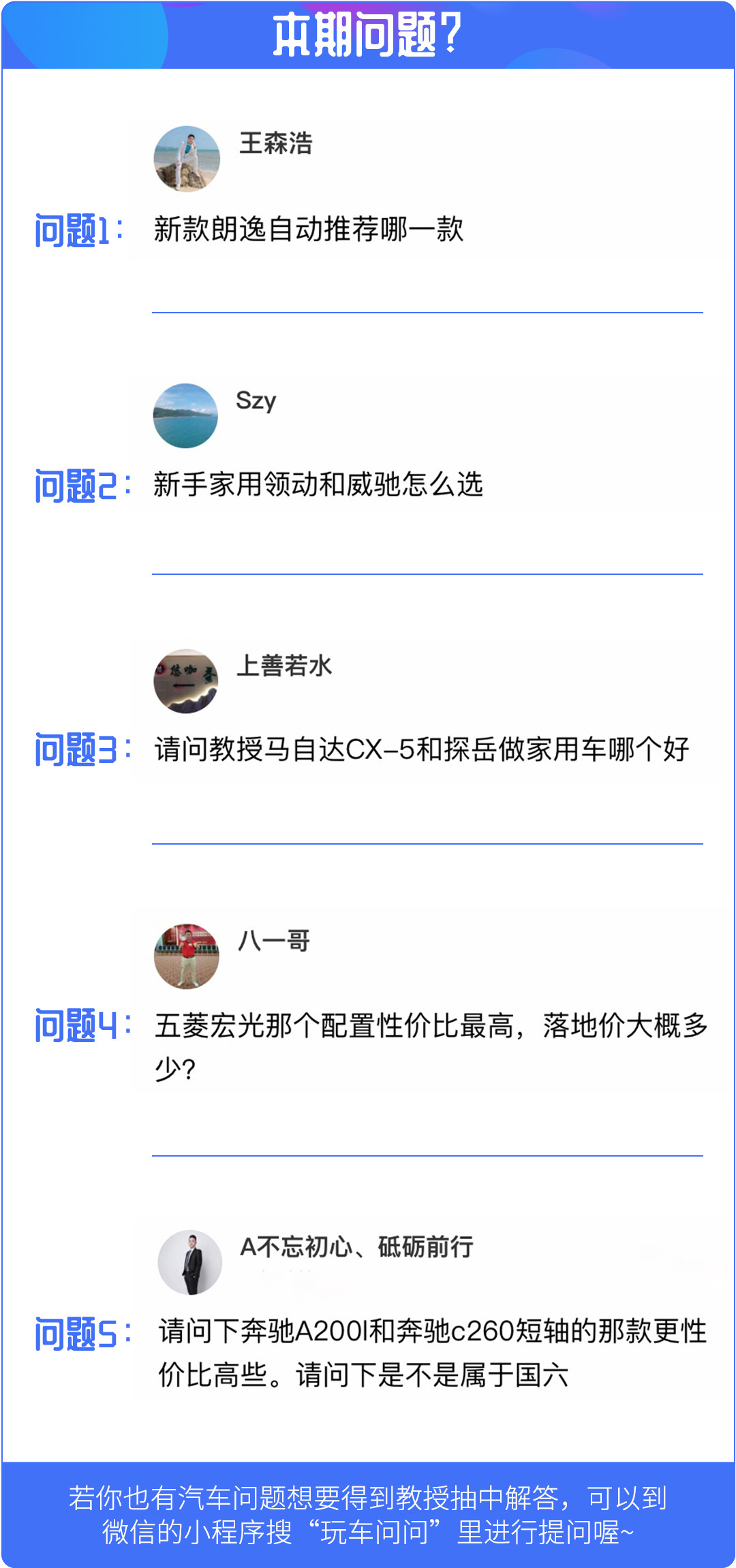 在网友问答栏目中教授将会在小程序-玩车问问里挑选5个问题进行回复,如果对购车、用车有什么疑问的话,欢迎点击下方玩车问问小程序,有许许多多非常厉害的技师为你解答喔!