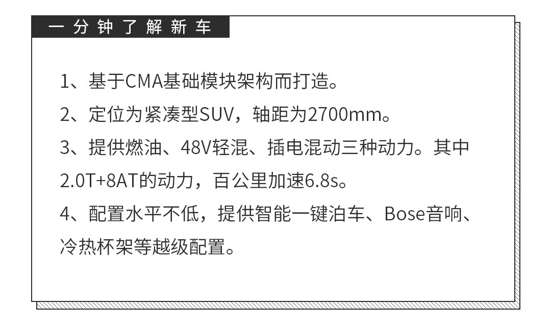 上面这几方面,教授就不说太多了,因为颜值好不好看,用户有不同的想法;配置丰富程度,最终也是看用户怎么去选;空间够不够大,更是要结合用户实际使用。所以,教授想多花些墨水在吉利星越被关注最多、且其自身也最重点宣传的地方:CMA架构和2.0T+8AT动力。