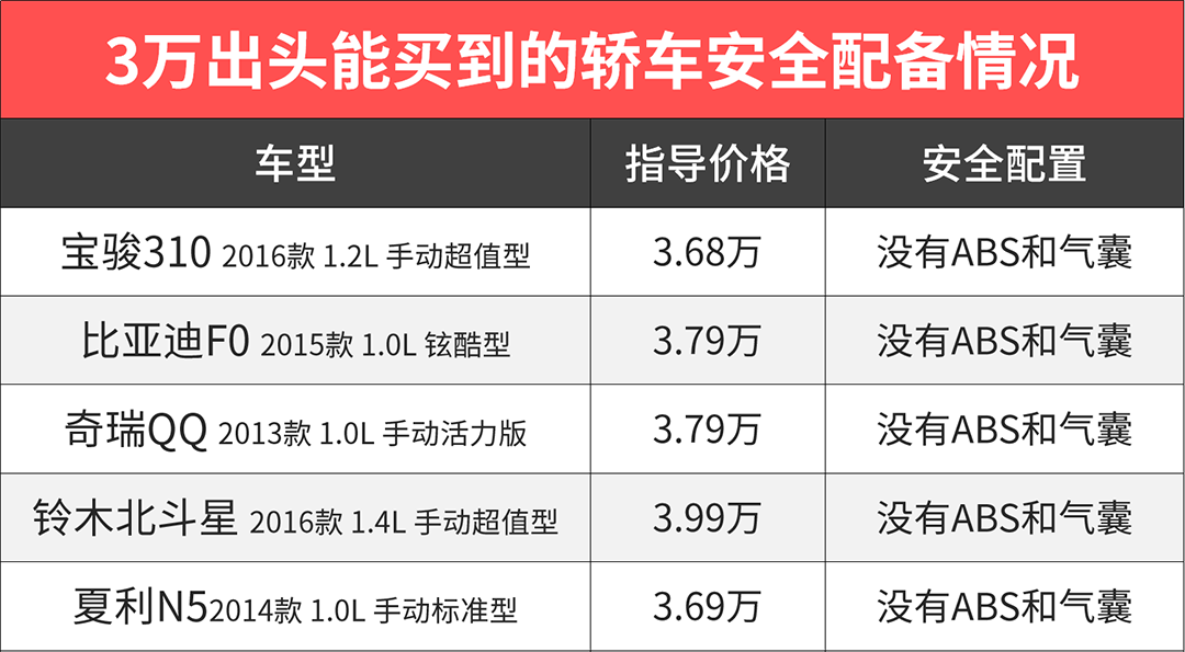 大多数人在看车时,目光更多地聚焦在外观好不好看、内饰够不够时尚、配置够不够高几个地方,但是在笔者看来,三万块的车设计、颜值简直一文不值,在这个预算里,真正首要的就是:安全!