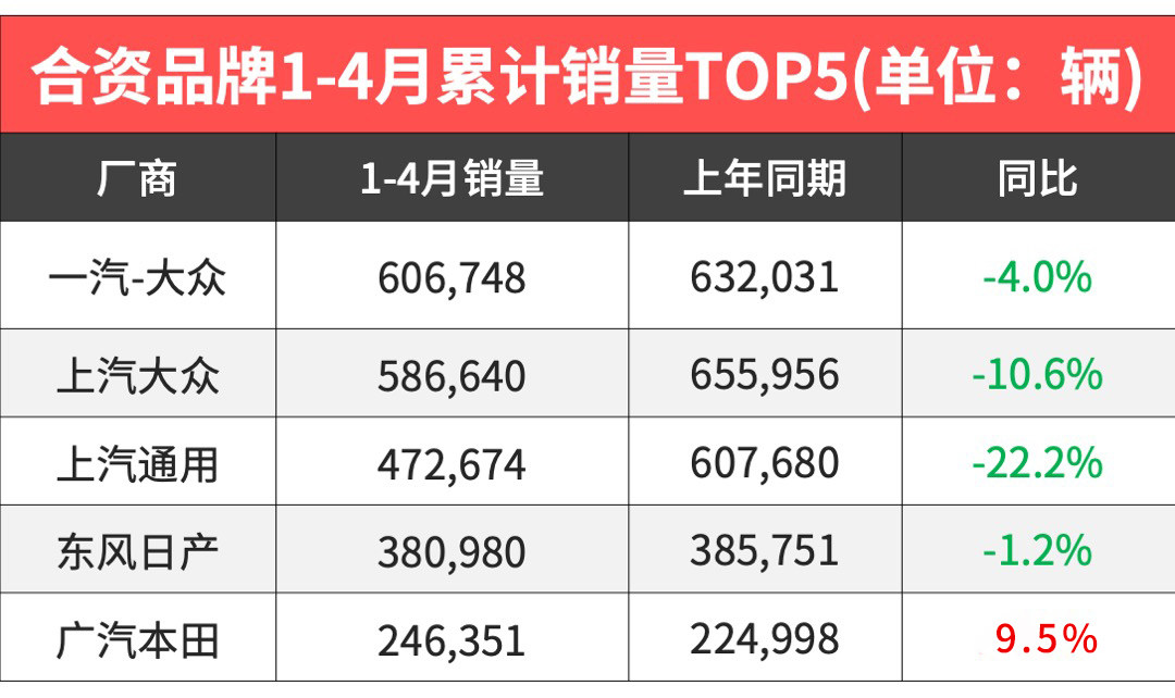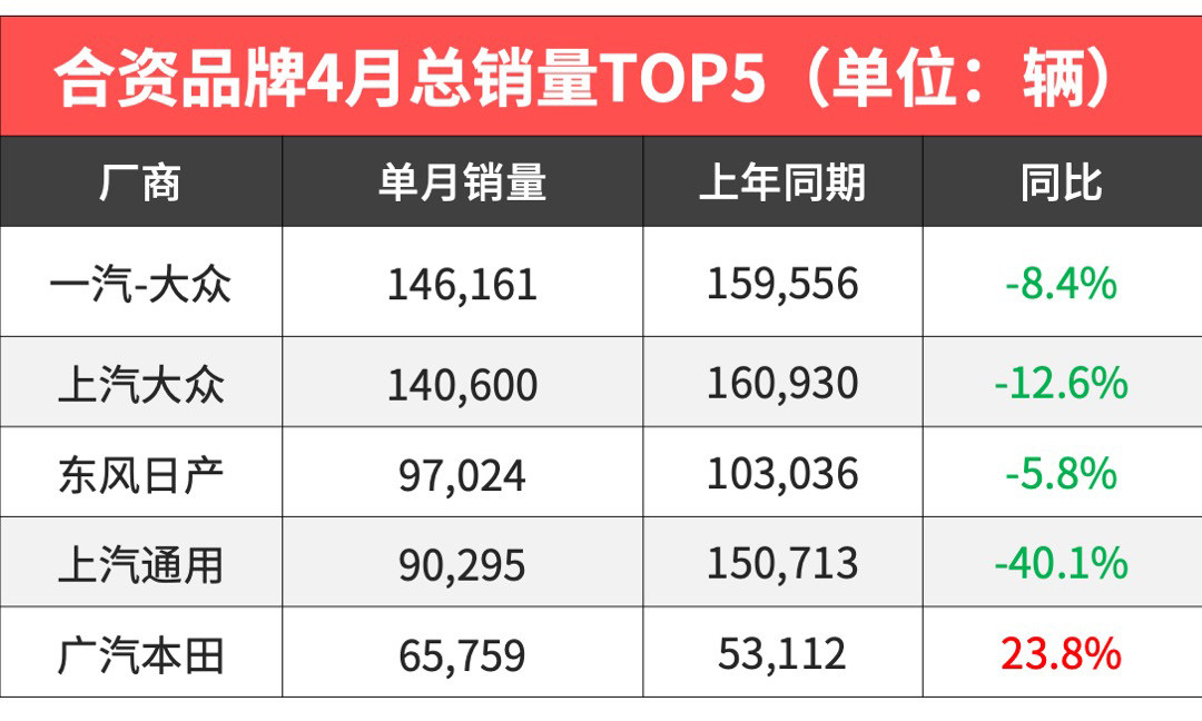 “五一”小长假过后,相信大部分人也像教授那样回到正常工作状态当中。所以各车企也不例外,纷纷公布出4月的成绩单,相比3月波动比较大。4月国内狭义乘用车市场销量达150.8万辆,同比下降16.9%,环比下降13.8%。那么,有哪些合资厂商稳拿前五名呢?那它们又是靠哪款车型来取得如此好的成绩呢?