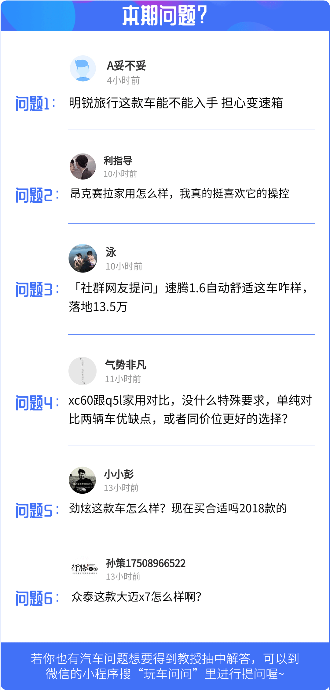 在网友问答栏目中教授将会在小程序-玩车问问里挑选5个问题进行回复,如果对购车、用车有什么疑问的话,欢迎点击下方玩车问问小程序,有许许多多非常厉害的技师为你解答喔!