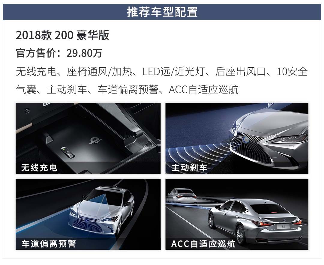 推荐低配并不是为了推荐而推荐,低配省钱固然是其中必不可少的因素,更重要的是雷克萨斯推崇的宾至如归式售后服务和十年如一日的过硬品质,低配车型同样可以享受。再回归到配置层面,以200豪华版为例不到30万的售价即可将并线辅助、车道偏离预警、主动刹车、自适应巡航、座椅通风、加热、主驾座椅电动记忆、车载空气净化器等高端配置收入囊中再结合中大型的定价、品质、服务,还买啥高配!