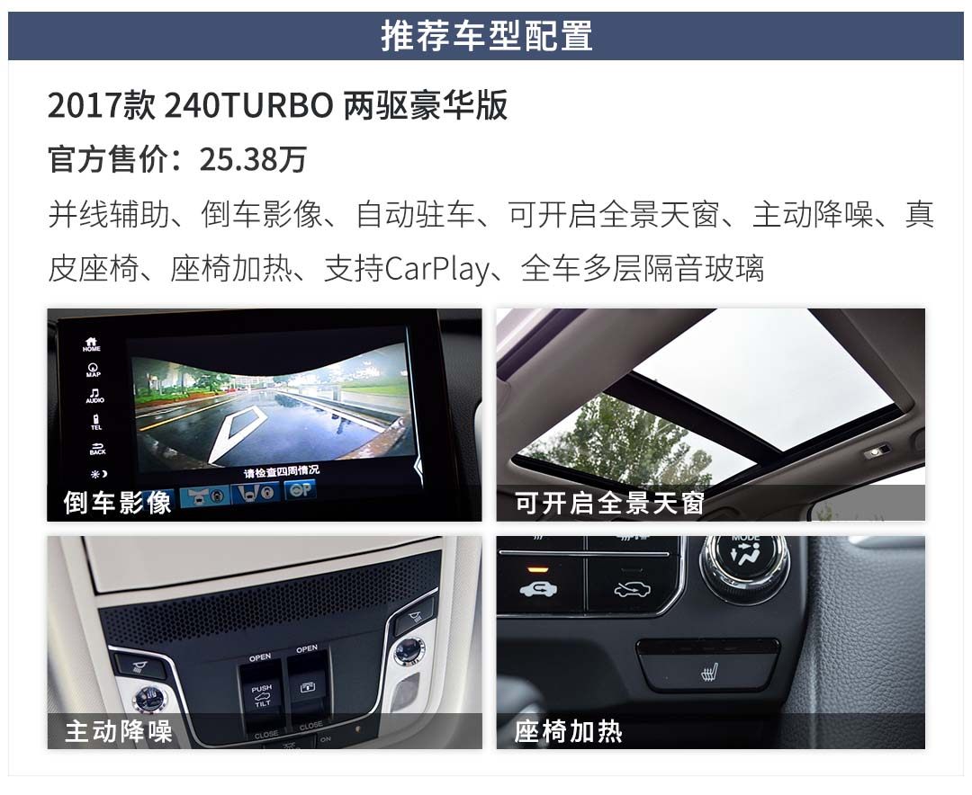 而在4款配备CVT变速箱的配置中,两驱豪华版无疑是首选。车内的座椅、方向盘、全为真皮材质,还有LED日间行车灯、前雾灯、并线辅助、车内防炫目后视镜确保行车安全。25万出头的价格+1.5T地球梦发动机属于价位竞品中的上流水准。