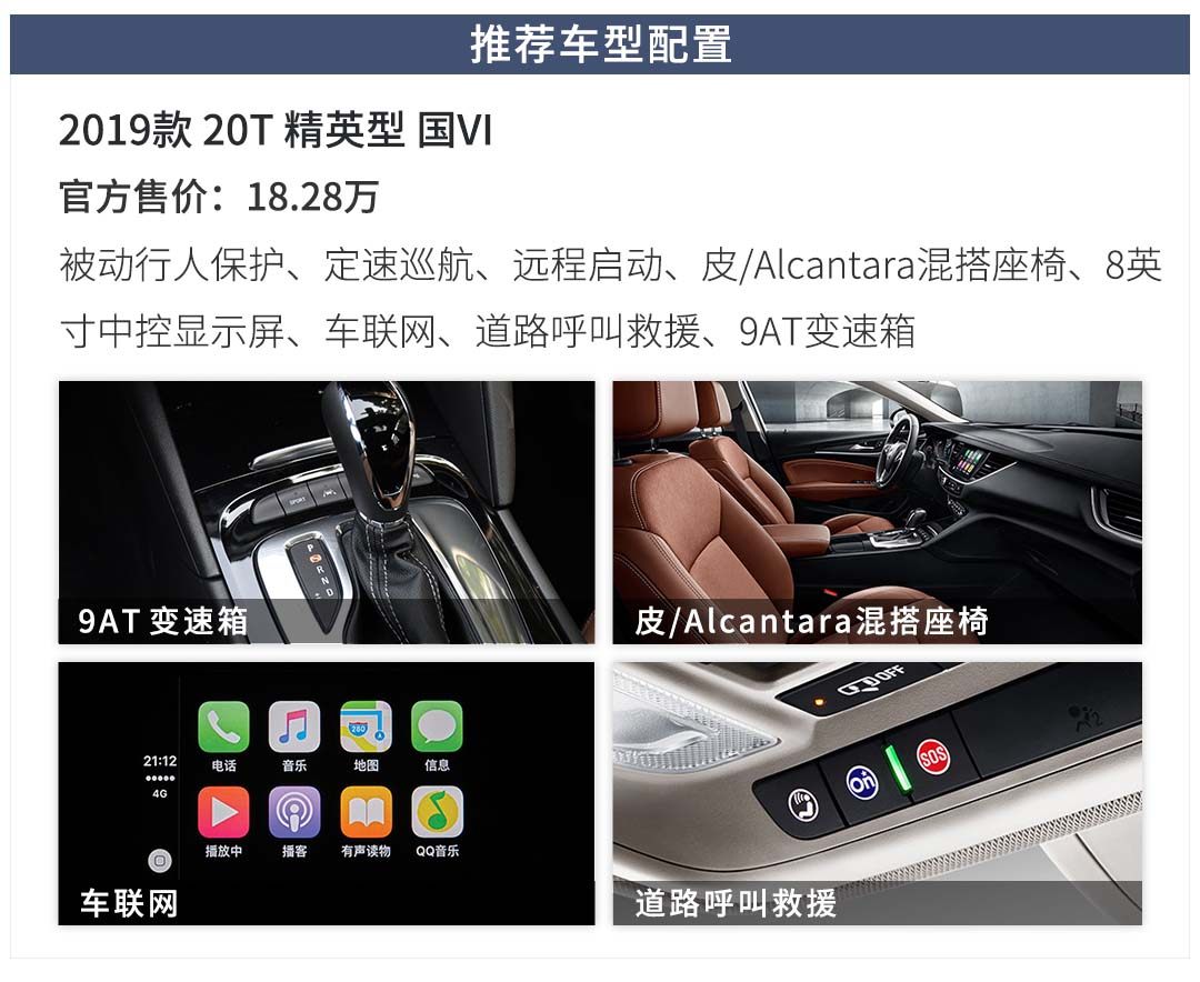 那么在众多的低配配置哪款性价比最高?不妨来看看20T精英型,比下的领先型多出前排座椅加热、氛围灯、真皮方向盘、Alcantara内饰面料、安吉星、定速巡航、车联网,这1万元花得超值!加上自己拥有的后雷达、上坡辅助、远程启动、座椅加热、LED日间行车灯,而且1.5T高配车型的eProtect智能安全系统有效使用次数并不高,综合而言20T精英型是最明智之选。
