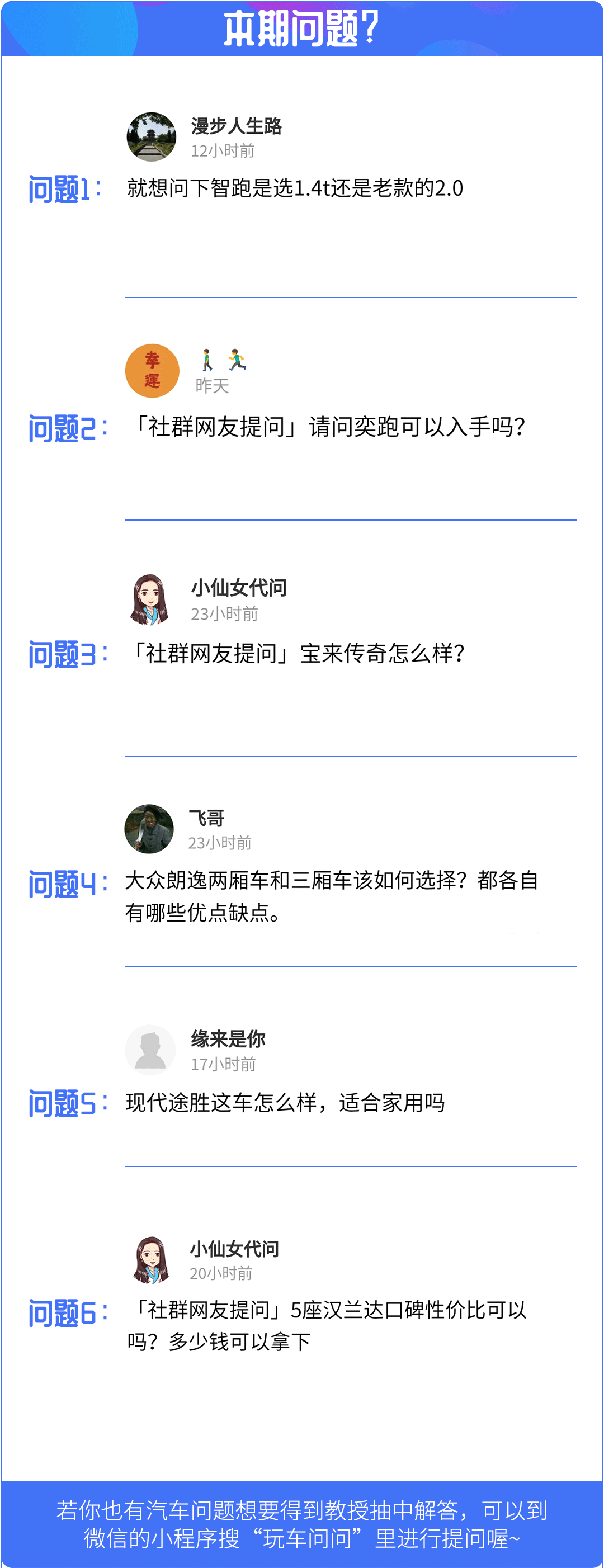 在网友问答栏目中教授将会在小程序-玩车问问里挑选5个问题进行回复,如果对购车、用车有什么疑问的话,欢迎点击下方玩车问问小程序,有许许多多非常厉害的技师为你解答喔!