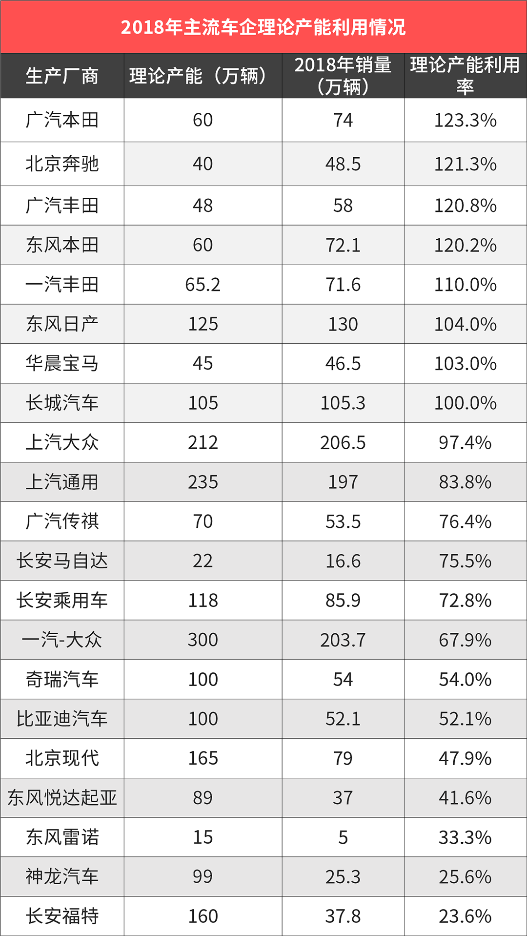 据悉,2017年中国汽车行业的产能(包含在建产能)就在6400万辆左右,而2018年汽车年产量仅仅2780万辆,产能利用率仅仅不到45%。理论上产能低于80%就处于不健康状态,而从2018年的表现来看,我们熟悉的长安、奇瑞、北京现代、比亚迪、东风悦达起亚等多家车企产能利用率都低于80%,甚至向来在国内十分吃香的一汽大众也仅仅67.9%。