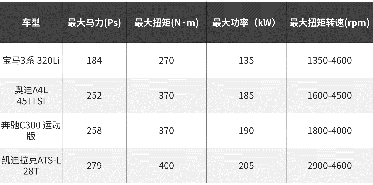 对比宝马3系、奥迪A4L、奔驰C级、凯迪拉克ATS-L各自的旗舰车型,数据上宝马的最大马力和最大扭矩的确不占优势。