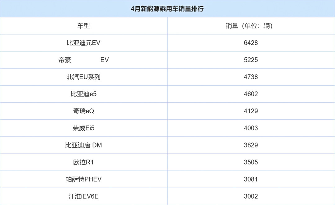 比亚迪元EV、北汽EU挤进销量版单前三甲,有趣的是,以往榜单前10车型大多数为微型电动车,但四月仅有三款微型车上榜,这表明越来越多消费者不再将电动车视为简单的代步出行工具,开始放心将品质、过日子的担子交由新生代电动车,未来可期。