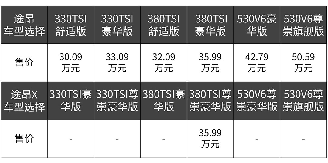 但是按照大众一贯的高调定价、参考已经正式公布售价的途昂X 380TSI尊崇豪华版版与途昂380TSI豪华版的定价完全重叠来看,途昂X的定价和途昂应该不会有太明显的差价,但会因为更加倾向年轻消费群体的造型设计以及全系5座的布局,而在价格上相较于途昂会做出稍微的让步,或许起售价格跌破30万元,是一个值得期待也是一个比较合理的价格。