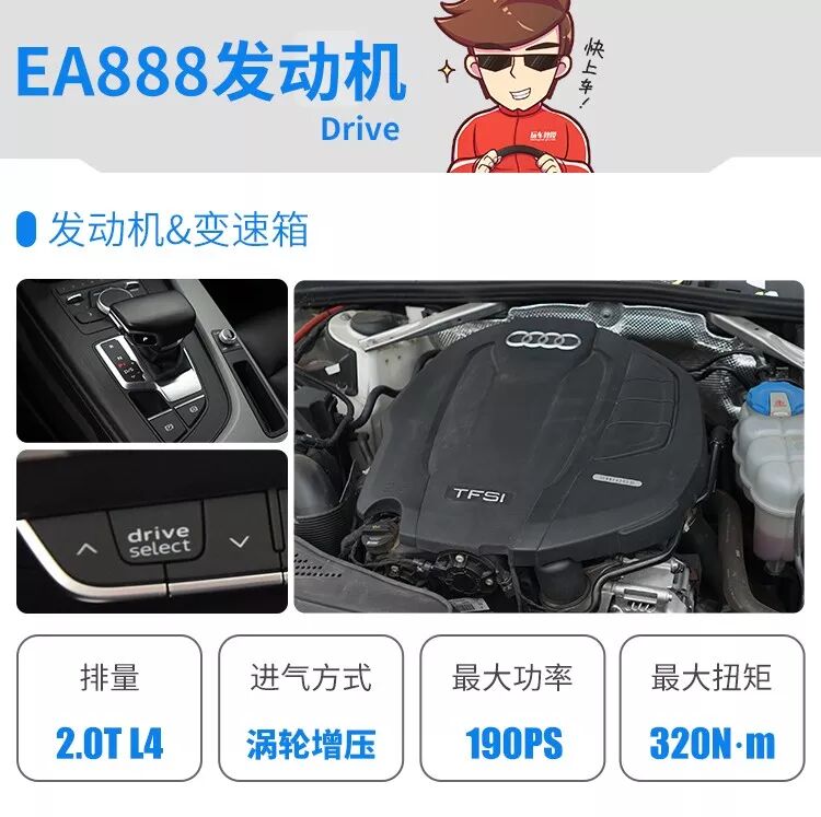 同样是加长型选手,但奥迪A4L的数据则从容不少,40TFSI 时尚型虽然没有quattro四驱加持,但搭载了江湖一致拍手说好的EA888三代发动机,也基本能保证不弱的加速能力。低功率版的EA888 2.0T发动机虽然功率所有下调,但集成了高压缸内直喷+歧管喷射的核心硬件并没有简配掉,其7速DSG双离合变速箱的口碑尚可。