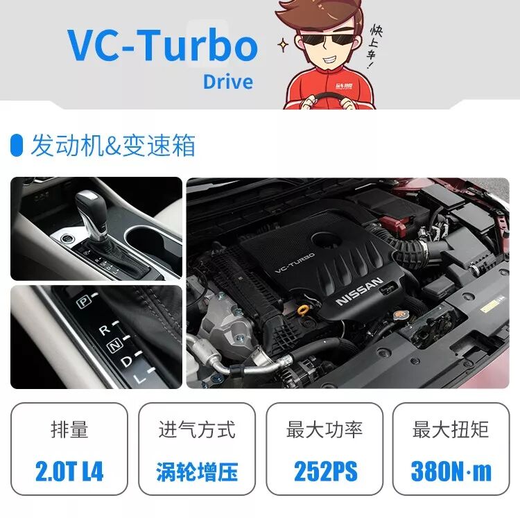 第七代天籁这台2.0 VC-TURBO可变压缩比发动机可不简单,从数值上来说,252马力的最大功率和380牛·米的峰值扭矩就足以秒杀大片对手,而且能耗方面比日产之前的2.0T发动机还降低了27%的油耗!实力之强隐隐有成为新一代2.0T神机的势头。