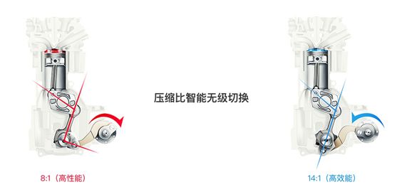 这副钢铁机器里蕴含了相当多的黑科技,比如可以实现压缩比由8:1(高性能)-14:1(高效能)之间实现无级切换,再加上混合喷射(歧管喷射+缸内直喷)、双循环(阿特金森循环+奥托循环)等技术以及可模拟8挡的CVT变速箱的加持下,真正实现了高性能以及低油耗的双重优势!