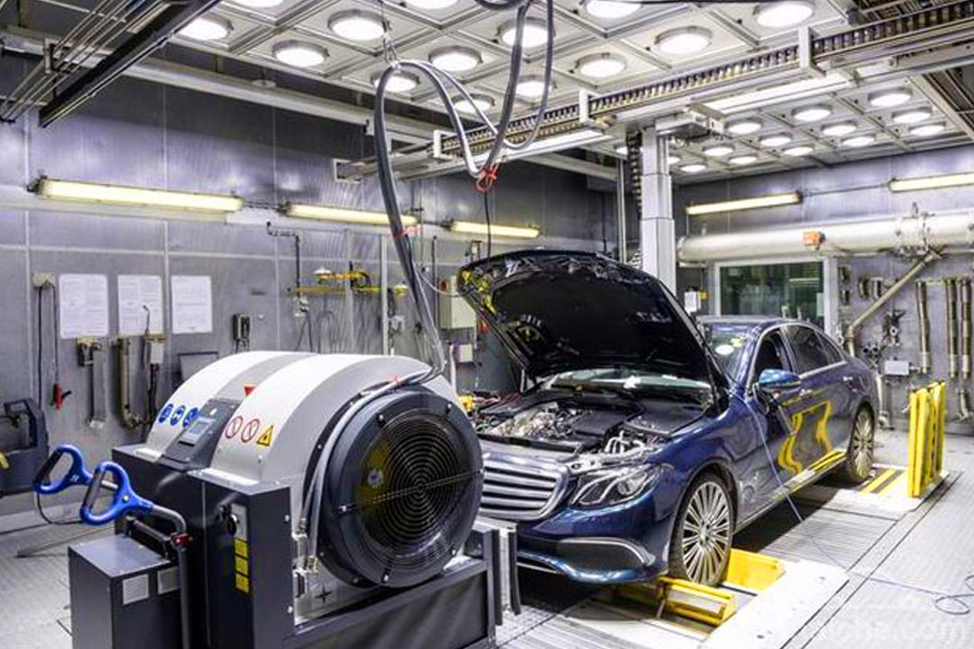 在车头前面还有一台鼓风机,用来模拟和当前车速相符的气流,这种测试在车辆研发过程中都会进行。值得一提的是在NEDC的测试中,测试时所有其余负载(空调,大灯,加热座椅等)都会关闭,所以测试的结果是接近车型的最大续航里程的,这点需要关注!