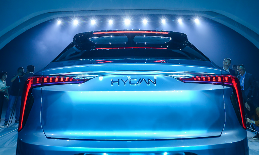 尾部的屁股微微翘起,回旋镖式的尾灯组十分犀利,同时镀铬饰条把尾灯连成一体,中间是“HYCAN”的英文标识,整体拥有不错的视觉效果。