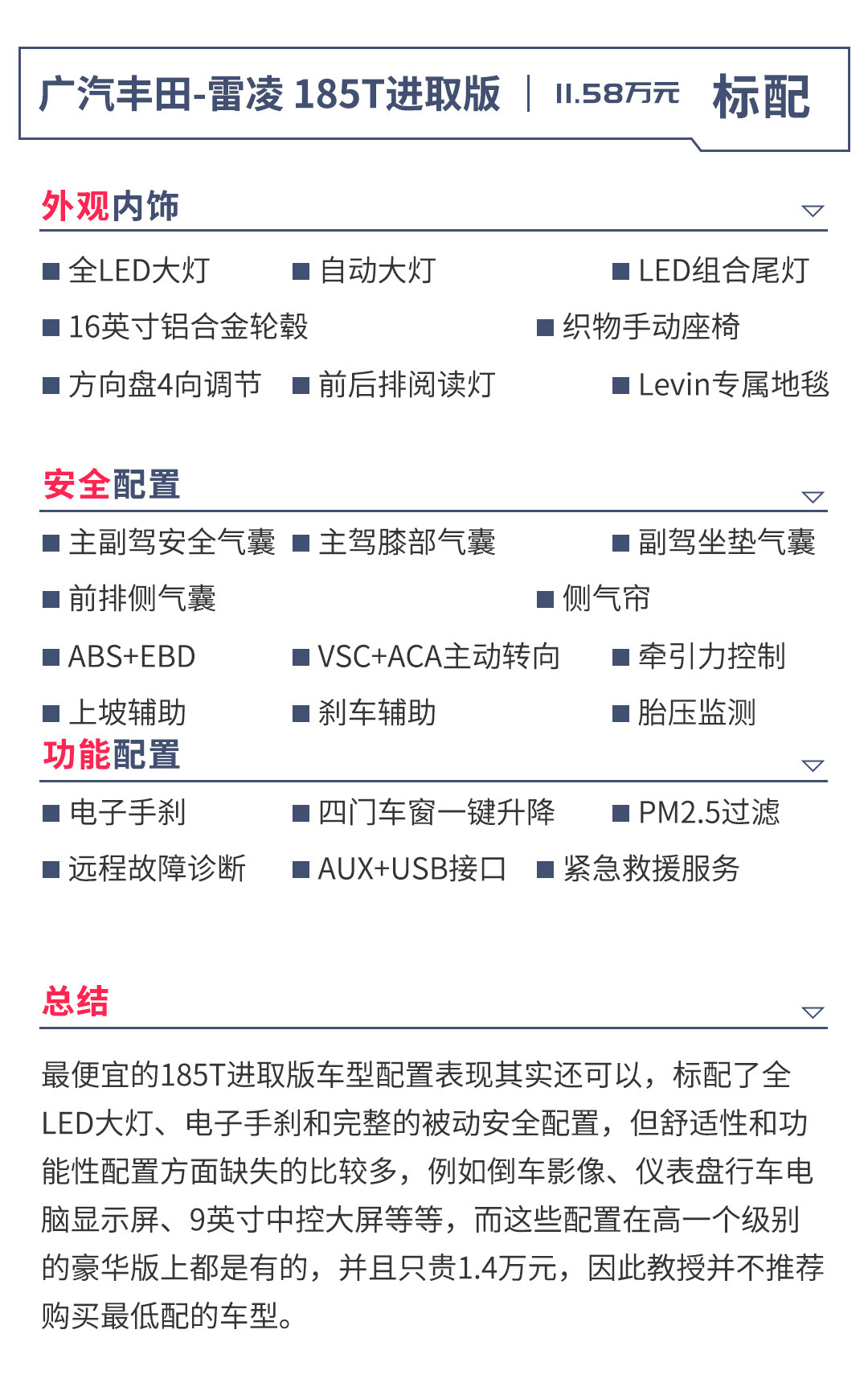 5月20日,全新一代广汽丰田雷凌正式上市,新车同步推出了汽油版和双擎版,每个版本都推出了5款配置,售价为11.58万-15.28万元。TNGA架构下的全新雷凌相比旧款车型有了全面的升级,但售价却和旧款基本保持了一致,那么新车该怎么选呢?请看教授的分析。