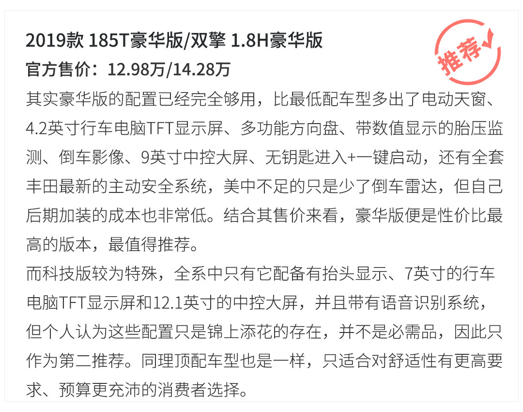 由于汽油版车型与双擎版车型彼此之前的配置差异表现是基本相同的,因此我们只以汽油版车型为例做配置分析并给出最终推荐。