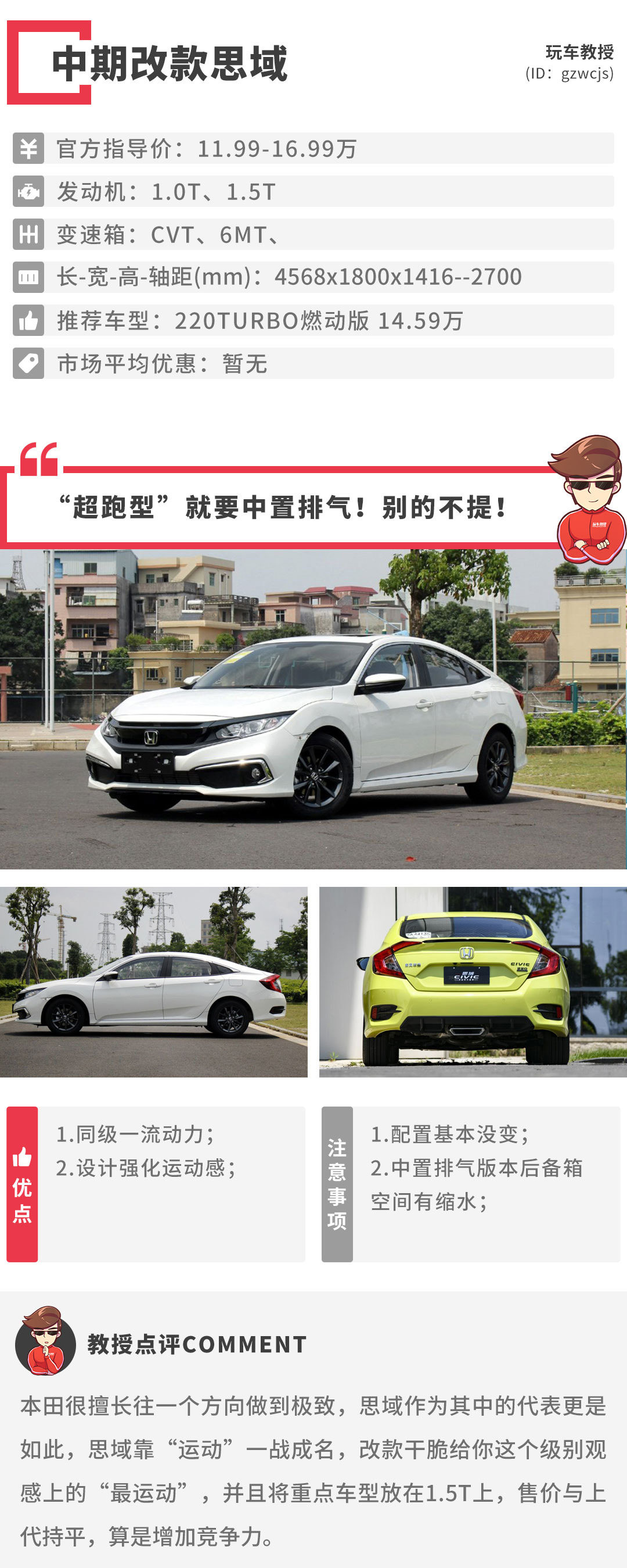 相对K3来说,中期改款的思域步子迈的就没这么大了,最大的改动就是:增加了“中置单出排气”。进一步加强运动的视觉效果,毕竟这代思域自上市以来,市场表现一直都很稳健,它还没到要用“颠覆”证明自己的时候。这样的改款也在情理之中:更好看,加了些配置,价格上收缩一点。虽然家庭轿车的竞争不断升级,但对于思域这样的大佬来说,静观其变倒是个不错的选择。