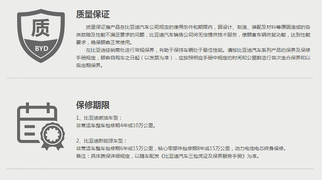 此外,作为国内靠生产电池发家的新能源汽车企业,比亚迪所推出的三元锂电池使用寿命高达120万公里,是打动不少潜在电动车用户的制胜法宝。质保方面,比亚迪新能源车质保6年/15万公里(非营运车),而三包有效期为2年/5万公里,非人为或意外情况下动力电池电芯终身保修。