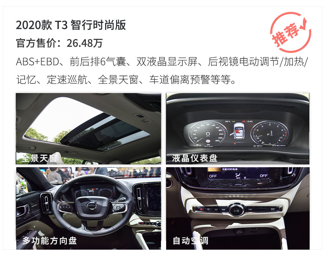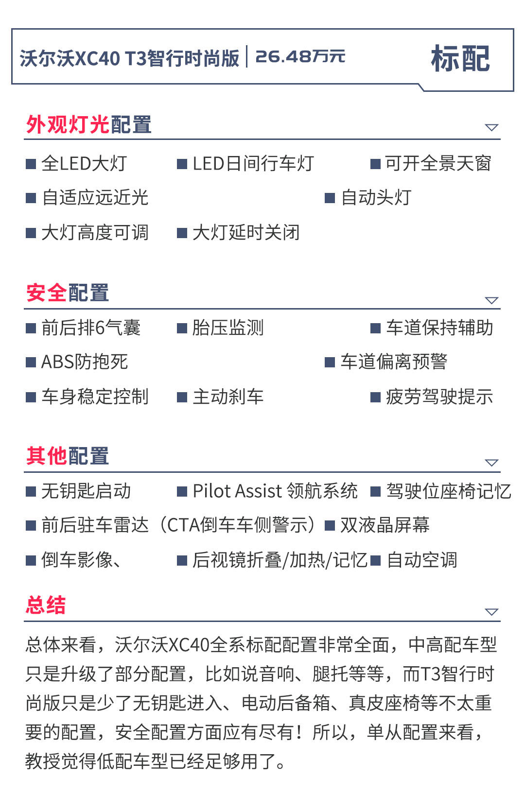 在教授看来,沃尔沃专注于安全方面,各车型之间安全配置并没有区别,使得最低配车型的性价比反而更高,所以教授更推荐最低配的T3智行时尚版,讲究的是一个实用!如果大家对沃尔沃的三缸没有信心,喜欢四驱动力,31.88万的那两个四驱车型无疑是比较好的选择。最后或许很多朋友会有这么一个疑问,顶配车型值不值得买呢?教授觉得,可以买,但没必要!