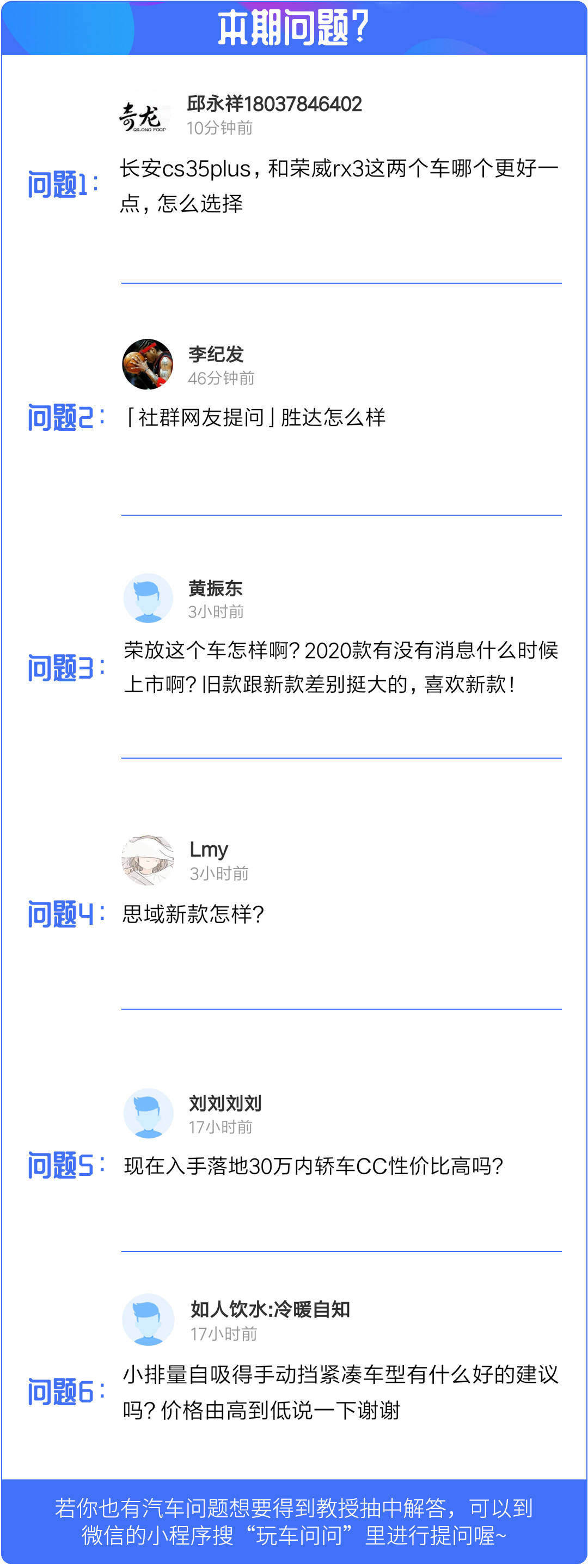 在网友问答栏目中教授将会在小程序-玩车问问里挑选6个问题进行回复,如果对购车、用车有什么疑问的话,欢迎点击下方玩车问问小程序,有许许多多非常厉害的技师为你解答喔!