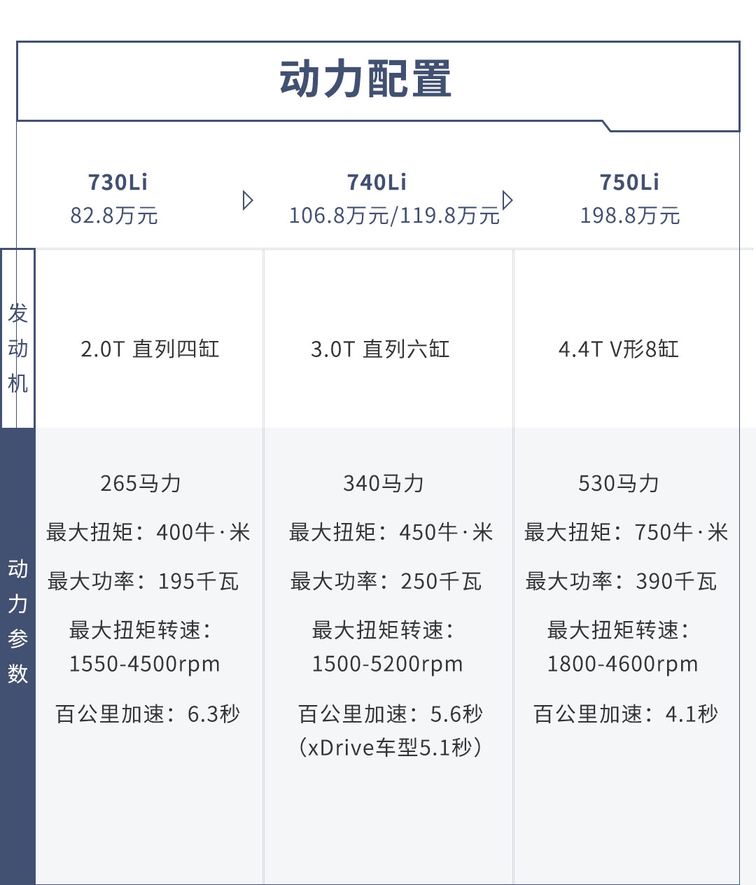 动力部分,新款宝马7系将搭载升级后的2.0升涡轮增压直列四缸发动机、3.0升涡轮增压直列六缸发动机和新推出的4.4升双涡轮增压V8发动机,它们分别对应730Li、740Li以及750Li车型,最大功率分别为265马力、340马力以及530马力。
