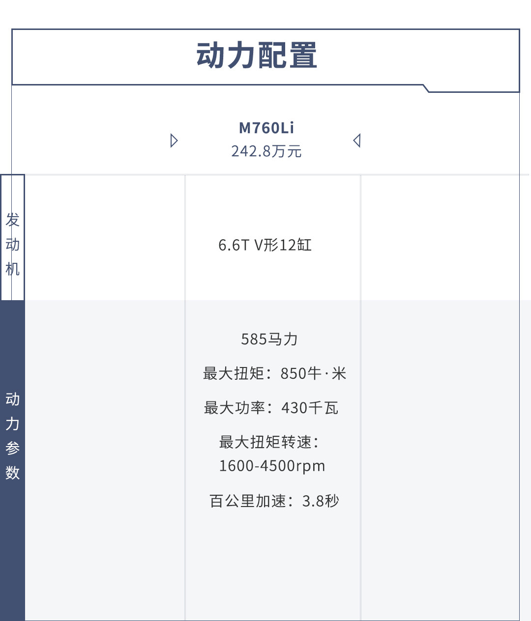 顶级的M760Li车型,它采用的是一台6.6T的V12发动机,最大功率达到585马力(430kW),峰值扭矩为850牛·米,零到一百公里加速时间仅需3.8秒,并且该车型独有魔毯悬挂。