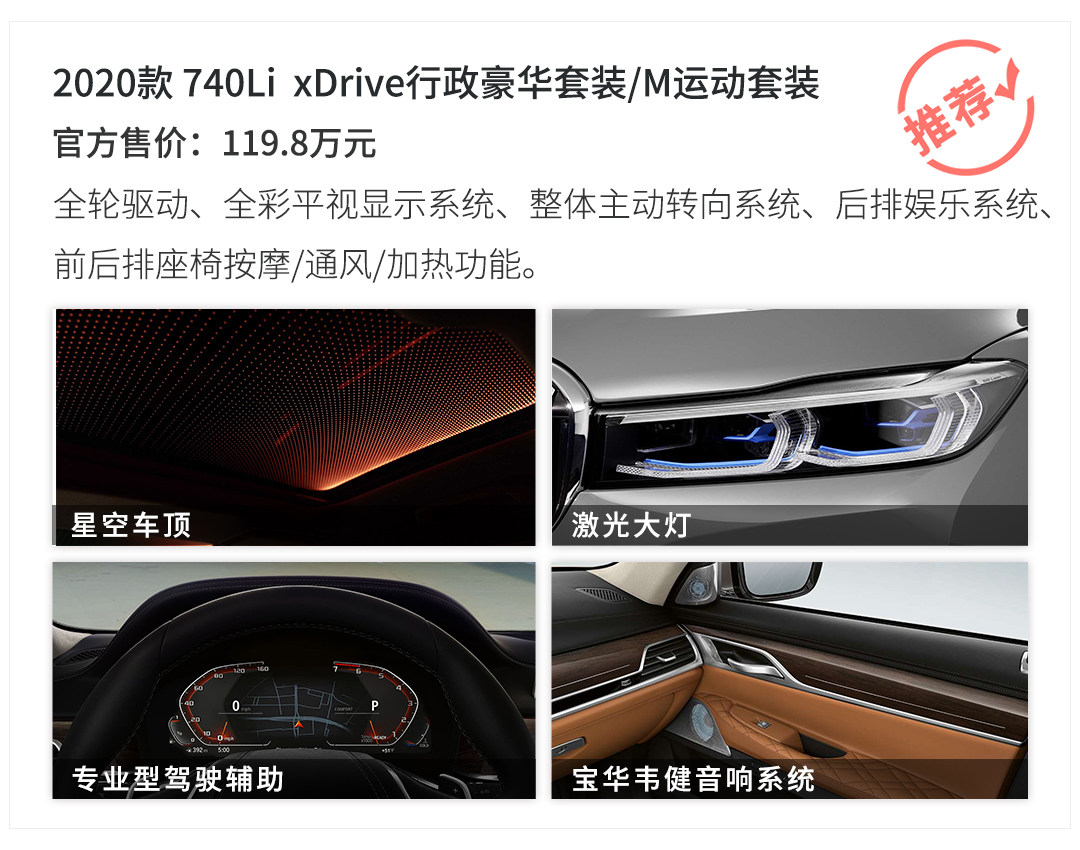 推荐购买的车型为740Li行政版本,四轮驱动更符合旗舰稳重的气质,即使你冲动至驾驶它下赛道,xDrive技术还能使你过弯更利落。它包含了星空车顶和激光大灯,由外到内绚烂夺目。其他一系列的驾驶辅助系统和娱乐、舒适系统将更有助于乘客享受旅途。