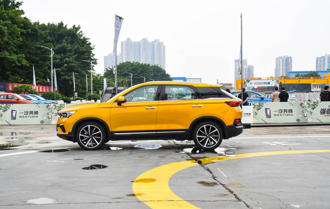 最美的一面在车尾45度,硬线条勾勒的车腰与贯穿式尾灯融合,奔腾车标和谐地置于中央。下方的护板面积很大,一方面保护车尾,另一方面起到抬高视觉点的作用,整个车尾避免了SUV车型的臃肿。