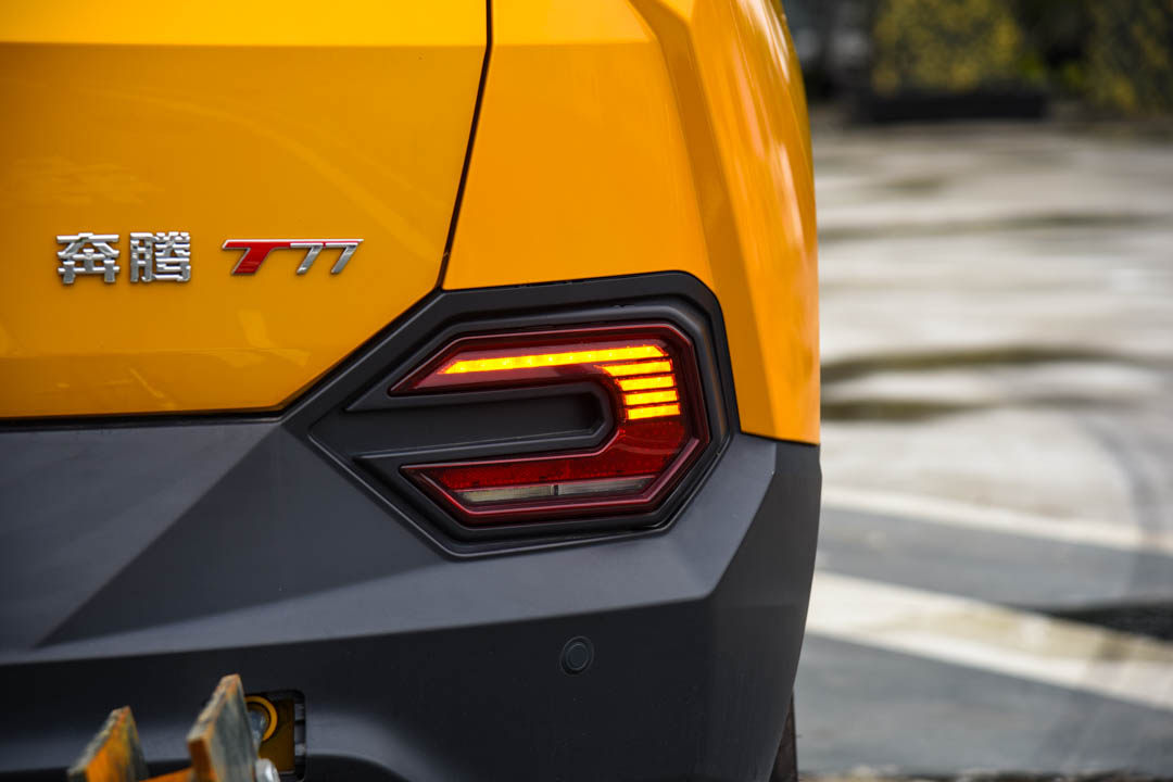 侧面能最直观地体现T77硬朗的气质,锋利的腰线毫不妥协地从车头直贯车尾,下方起伏的副腰线使得侧面更具立体感。悬浮式车顶的后开口更大,运用镀铬饰条分离出车身和侧窗,上方的车顶向后逐渐收窄,赋予它轿跑车的气质。