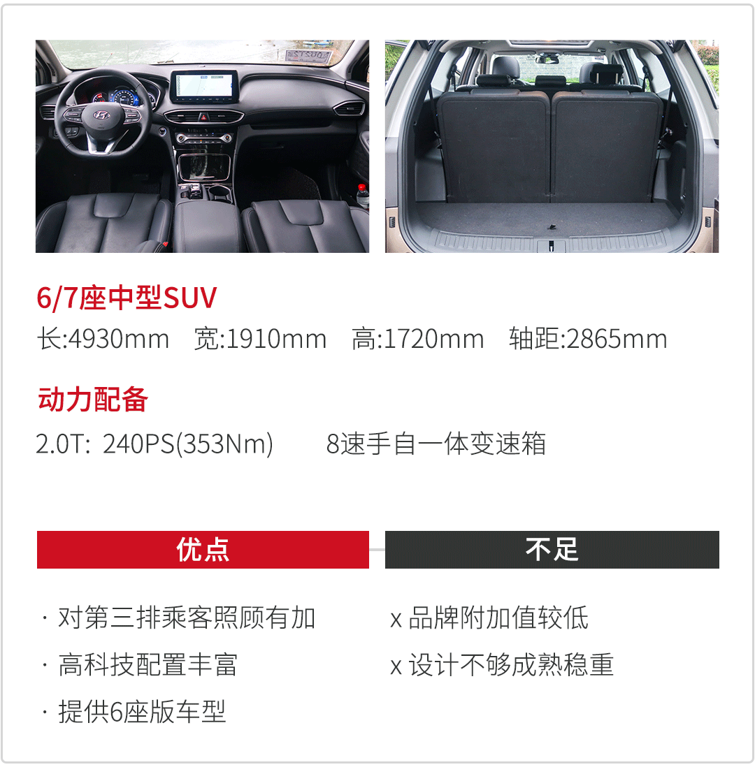 适合人群:如果您想买一台第二排带独立座椅的6座中型SUV,那么胜达就是唯一的选择。
