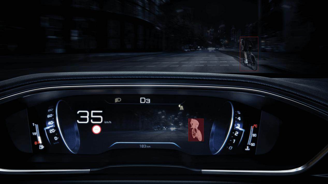 夜视系统在昏暗的地方驾驶时会自动开启,可以识别车前15米-150米的行人或动物,有多个人出现时也会及时的做出判断,如果侦测到前方有行人会立刻提醒驾驶者,必要时候可以协同制动系统进行主动刹车,大大提升了行车的安全。