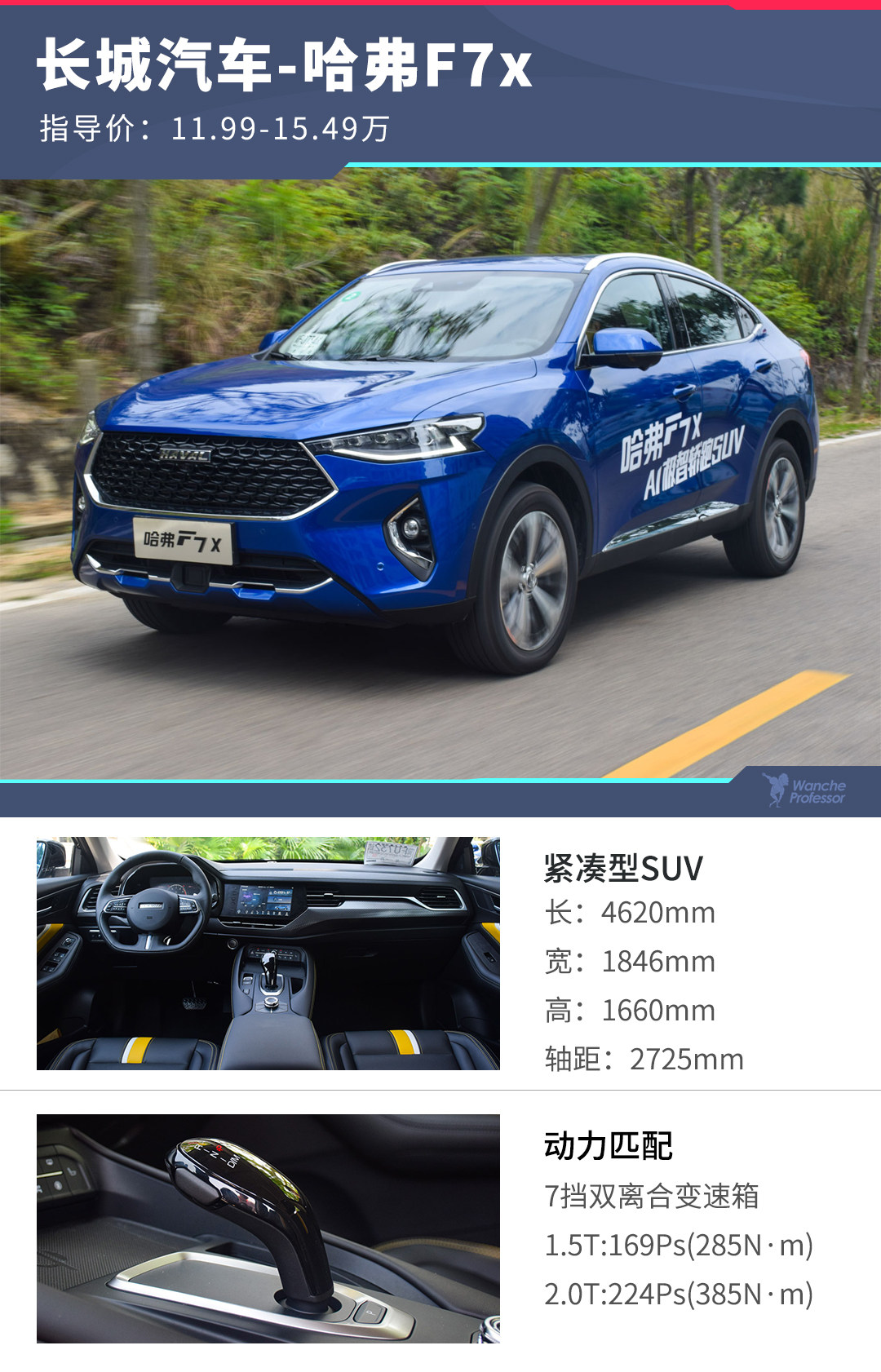 轿跑造型的外观设计、大胆多彩的内饰搭配、运动风格的动态表现都是哈弗F7x的卖点。1.5T+7挡双离合的动力总成已经广泛使用在哈弗旗下车型中,虽然2.0T发动机能让动力后劲更好、驾驶乐趣更足,但相信走量的还是1.5T车型。