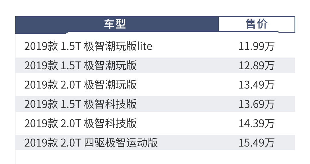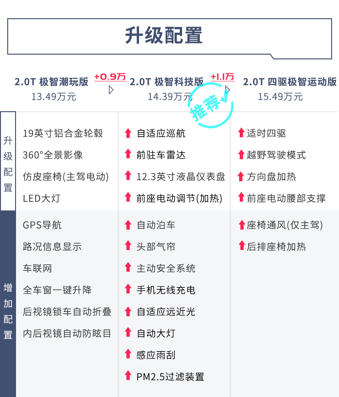 由于1.5T和2.0T都有极智潮玩版和极智科技版,除了发动机之外,其他配置完全相同,因此我们下方的分析仅以2.0T车型为例。