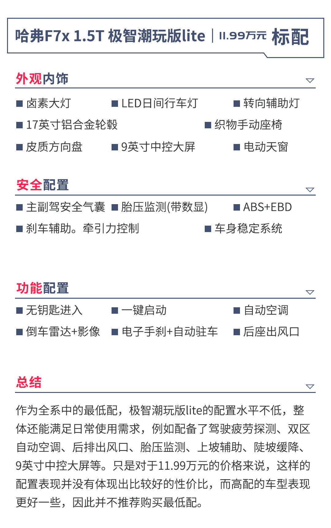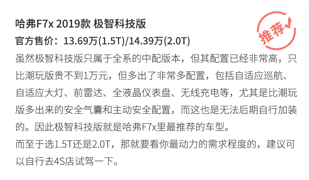 哈弗F7x的极智运动版已经正式上市,加上此前已经上市的极智潮玩版和极智科技版,整个车系共有6款车型,提供1.5T和2.0T共两款发动机选择,官方指导价为11.99-15.49万元。想知道这辆哈弗首款轿跑型SUV该如何选吗?一起来看看教授的配置分析吧。