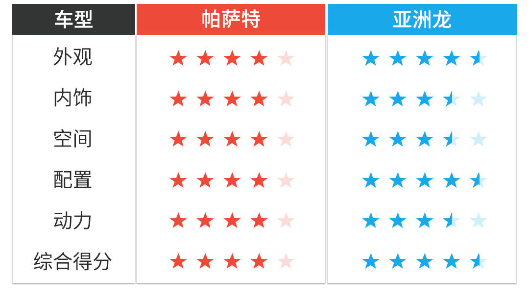 综合来看,其实这两款车都是矛盾的综合体,帕萨特虽然是商务型的轿车,动力却非常的躁动,亚洲龙看起来是运动型的轿车,实际体验却是温文尔雅的潇洒“公子”。亚洲龙之所以多出的那半颗星,是教授给比较认可它的安全配置,还有就是作为18岁的小鲜肉,教授还是比较中意亚洲龙的颜值的。