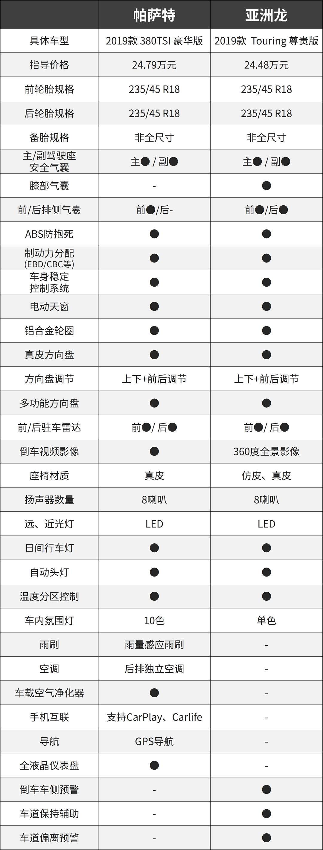 在配置方面,我们就以24.79万元的帕萨特380TSI 豪华版和24.48万元的亚洲龙2.5L尊贵版做一个对比来看看,价位相差不大的情况下,他们的配置表现如何呢?