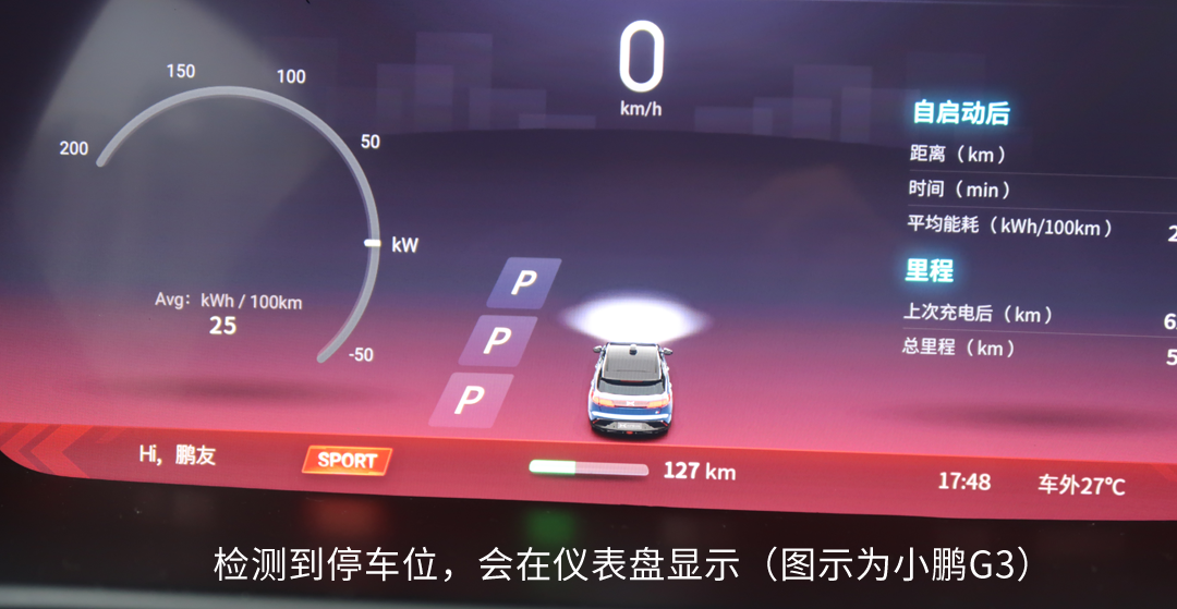 还有值得一说的是,小鹏G3自动泊车的启动方式比较丰富,除了方向盘的物理按键激活外,还能通过语音对话以及点击大屏的泊车功能完成操作。