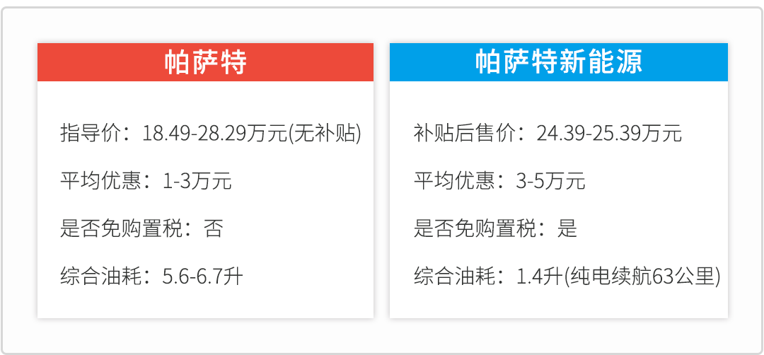除了多出一套单电机混动系统和动力电池,并把变速箱从7速双离合更换6速双离合为外,帕萨特新能源在发动机等其它机械硬件上都与1.4T的燃油版帕萨特高度一致,但是新能源版即使算上补贴和终端优惠,其价格也依然比1.4T燃油版高出不少,与燃油版的2.0T低功率车型持平。况且1.4T燃油版帕萨特的动力感受就不怎么样,而帕萨特新能源版也是一样的1.4T引擎,车重却要更大,若是遇到电池低电量或是亏电的情况,那么动力感受可想而知,此时的油耗表现也不会好到哪里去。