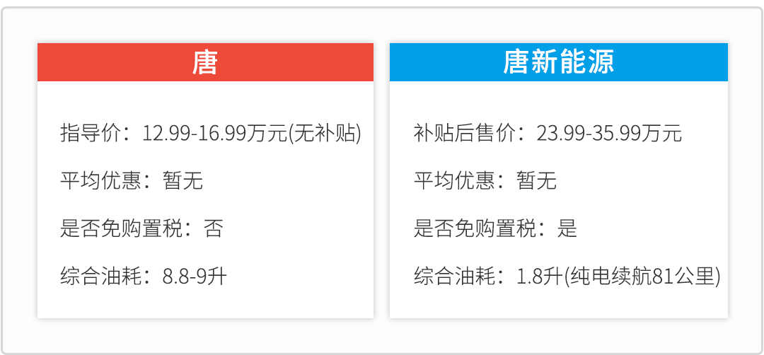 由于唐新能源的动力电池容量大和纯电续航大、电动机马力更是接近400匹,在性能的打造上可谓“不计成本”,因此即使算上补贴,唐新能源售价最低的车型,也要比唐燃油版的顶配车型贵7万元,这么大的差价就足以把两款车的目标客户区分开,唐燃油版的受众在20万以内,用户就算考虑新能源车,也不会买唐新能源,而是会买价差不多但级别低一级的宋新能源;同样,唐新能源的受众在20-40万,用户就算考虑燃油车,也看不上唐燃油版,而是会买丰田汉兰达等车型。