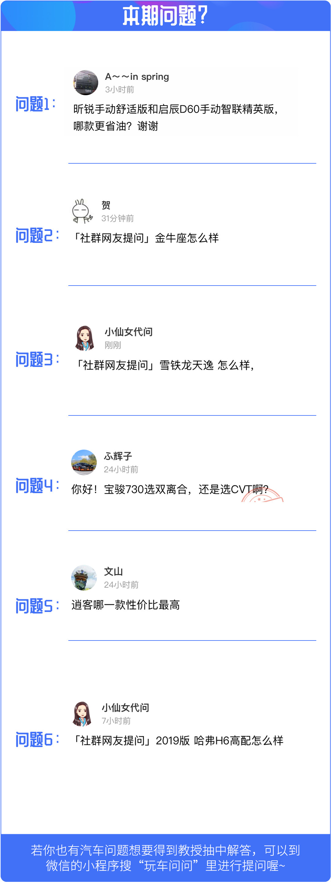 在网友问答栏目中教授将会在小程序-玩车问问里挑选5个问题进行回复,如果对购车、用车有什么疑问的话,欢迎点击下方玩车问问小程序,有许许多多非常厉害的技师为你解答喔!