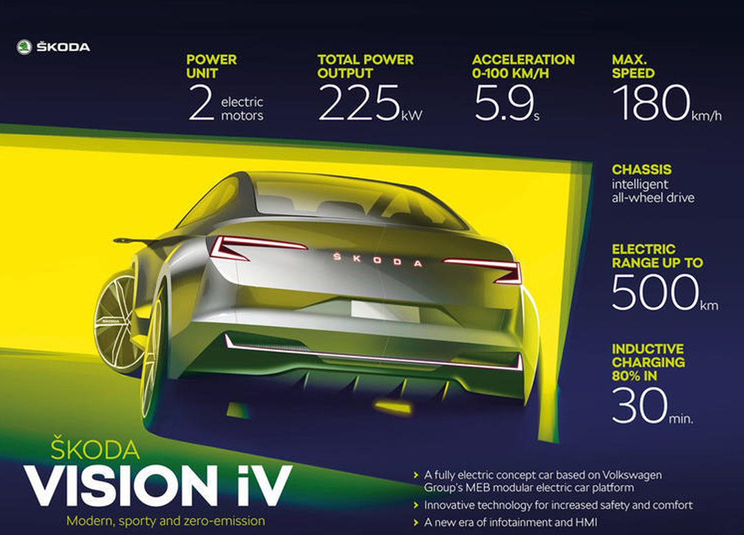 此外,斯柯达VISION iV将由前桥和后桥上的双电动机组成四驱系统,官方公布动力系统最大功率为226kW(306Ps),百公里加速仅需5.9秒,在电动机总功率层面上它表现出色,符合轿跑车型的定位。