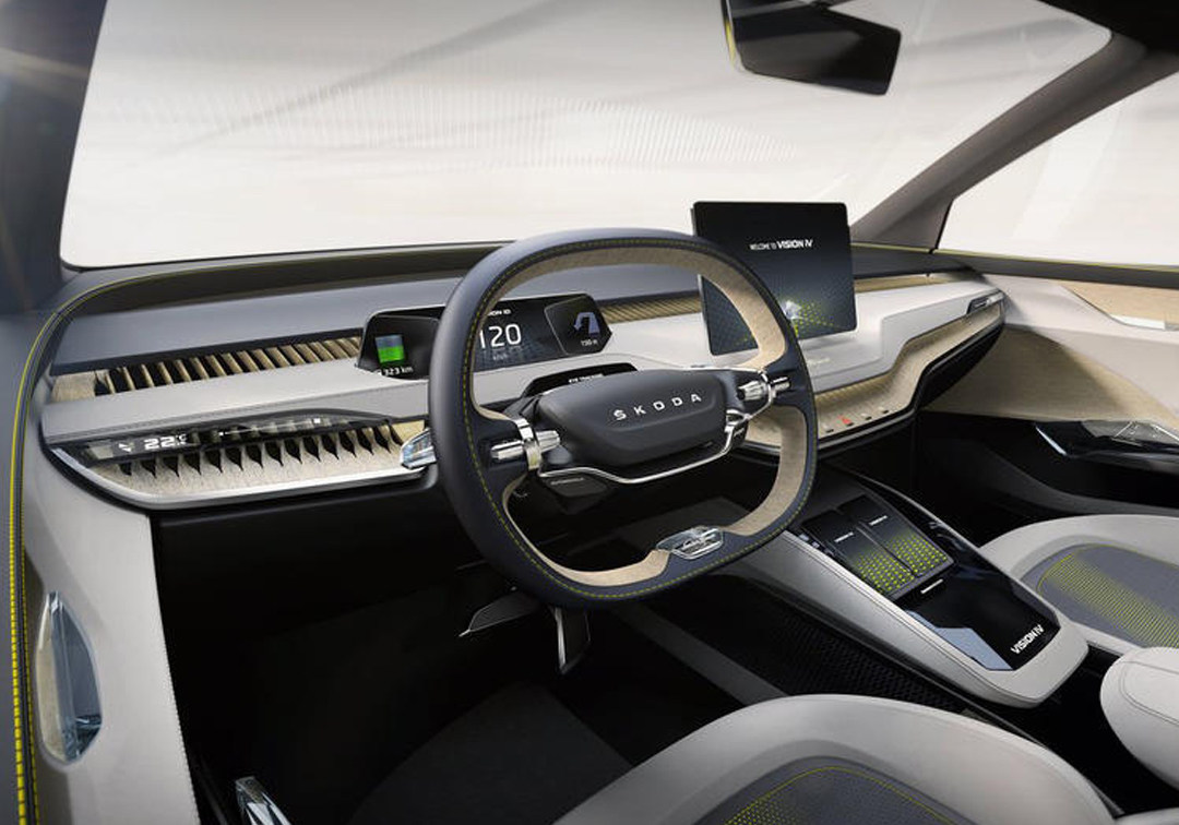 独立式的大尺寸中控屏带来了突出的未来感,而且多媒体控制、车辆智能设置集合其中。在中控台的下方,设置有无线充电功能。根据厂家公布的信息来看,斯柯达VISION iV 能够通过监测驾驶员的眼部运动和心率,来判断驾驶员注意力是否集中。